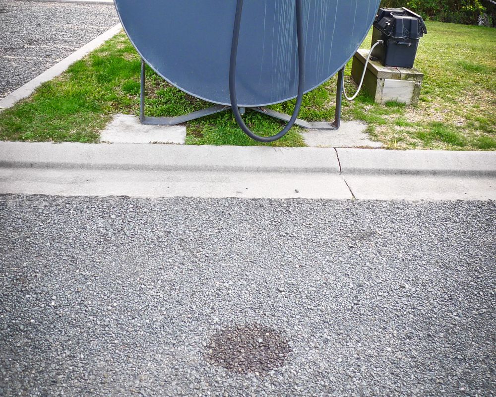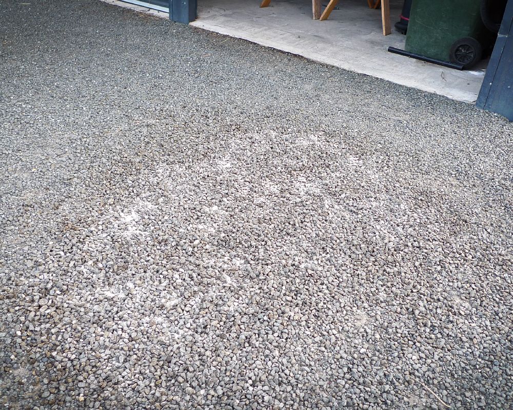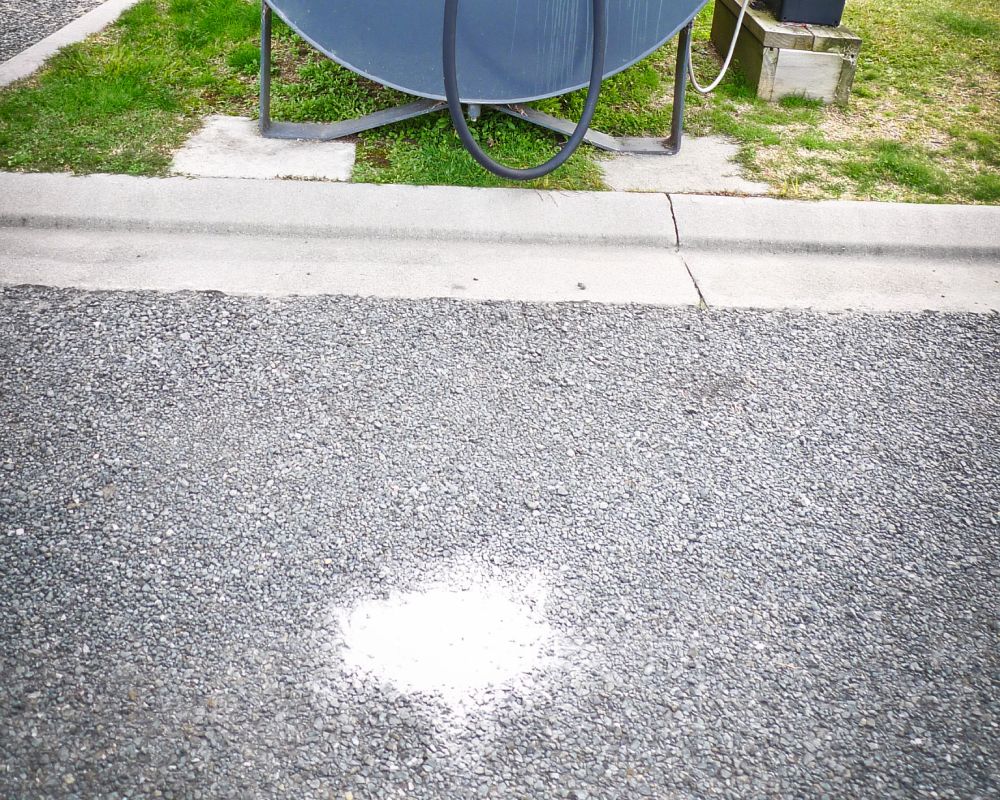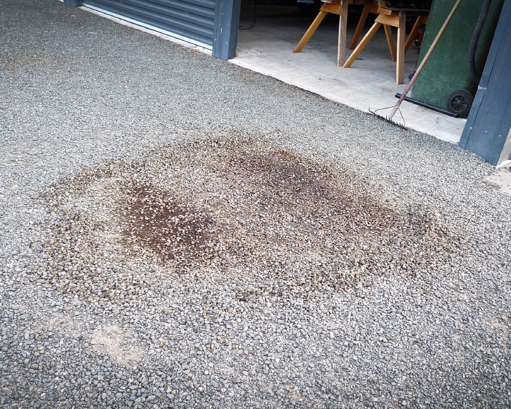 Removal of oil spot stain on asphalt, bitumen. This workshop driveway had decades of oil drips in the vehicle storage driveway area. Here we used Terminator-HSD Concrete Cleaner, so that is would show up more on the images. Over a 5 week period and four applications. Each application a week apart the stain was fully remediated. Leaving a clean unblemished area. What’s more, it’s completely safe for the water runoff catchment.
